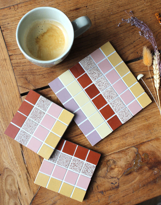 Paire dessous de verre en carrelage avec carreaux mosaïque coloré multicouleur, fait main céramique grès cérame, idée déco maison et table