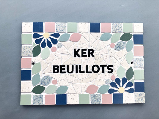 Plaque numéro nom de maison porte en mosaïque céramique 15x18cm style floral, déco personnalisable