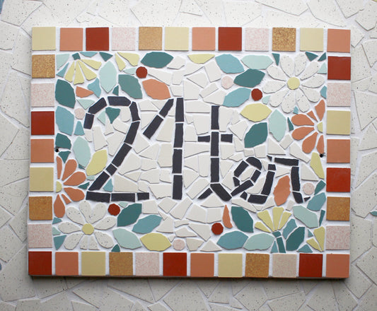 Plaque adresse numéro de maison ou porte en mosaïque céramique 21x27cm à accrocher, style floral, possibilité de personnaliser